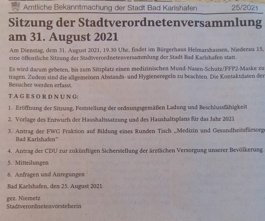 Für die Stadtverordnetenversammlung am Dienstag den 31.08.2021 bringt die FWG einen Antrag zur Optimierung der medizinischen Versorgung in unsere Stadt ein- wie in unserem Wahlprogramm bereits angekündigt.
