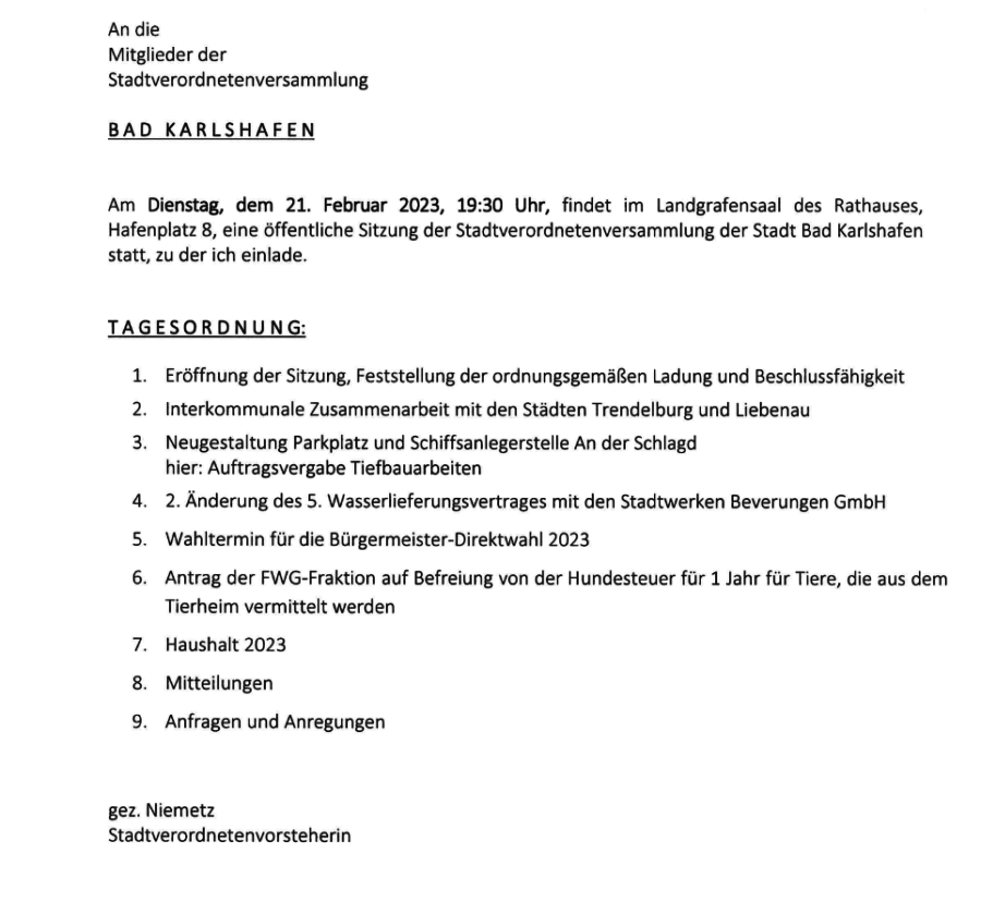 Nächste Stadtverordnetenversammlung am Dienstag den 21.02.2023